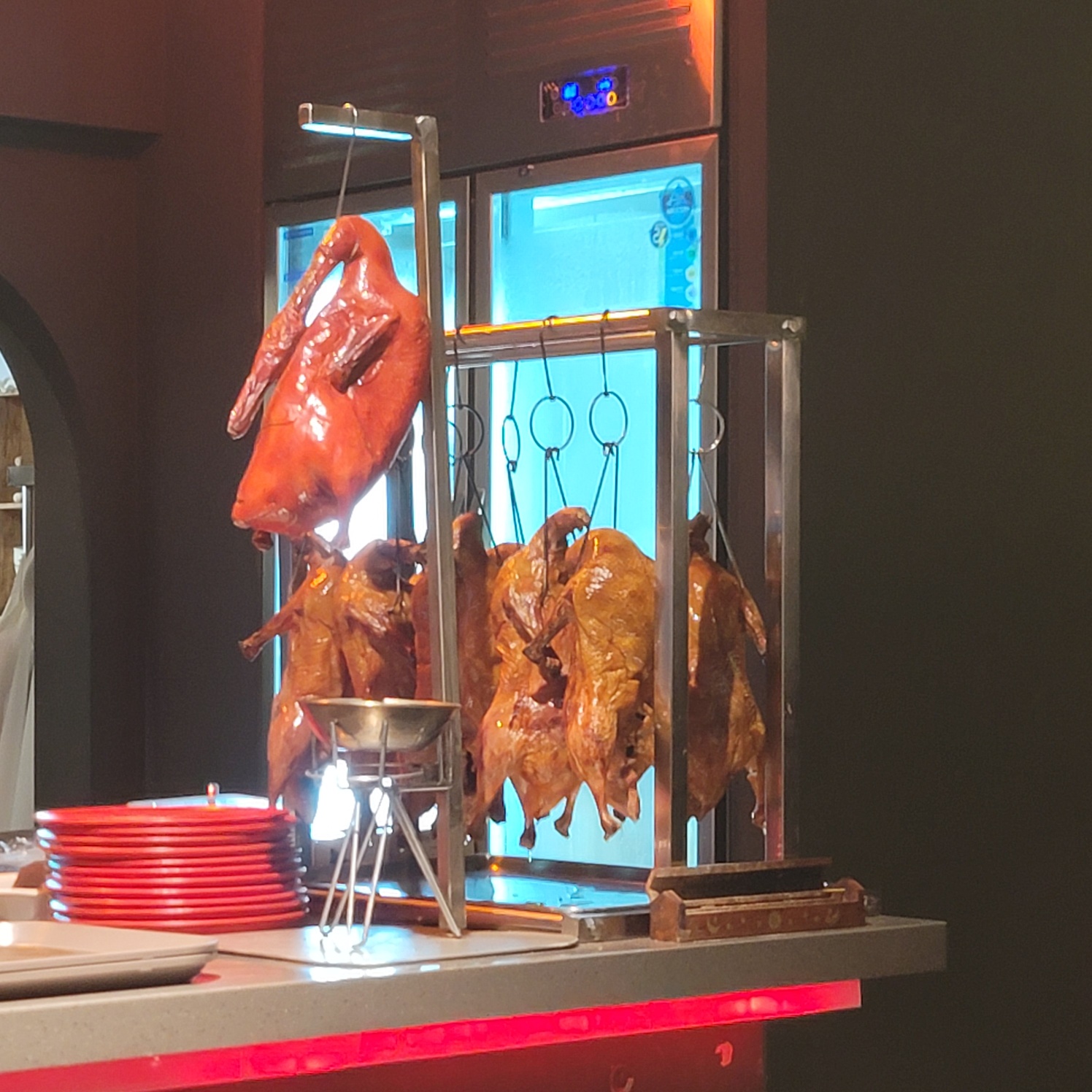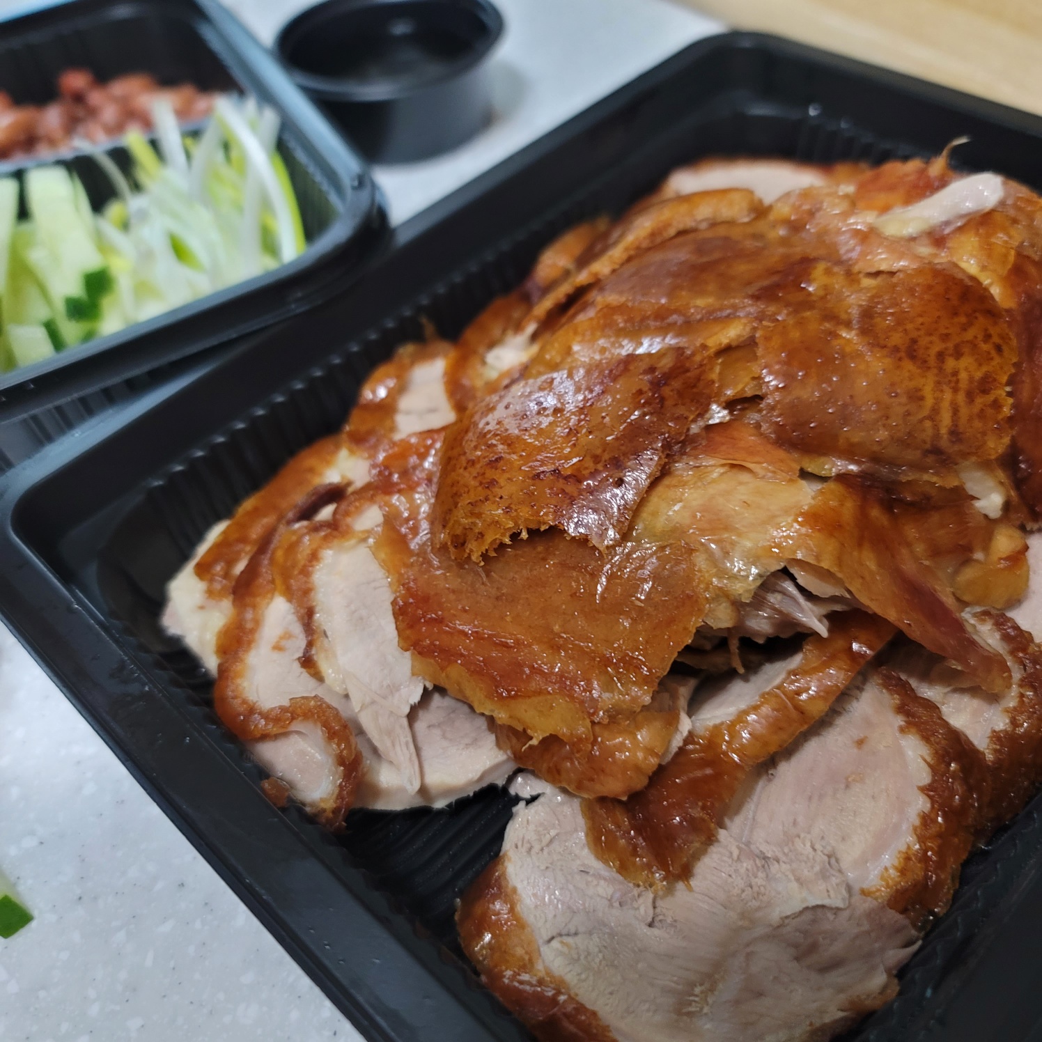 전통적인 중국식 방식으로 조리된 오리는 껍질은 바삭하고 속살은 촉촉하며,