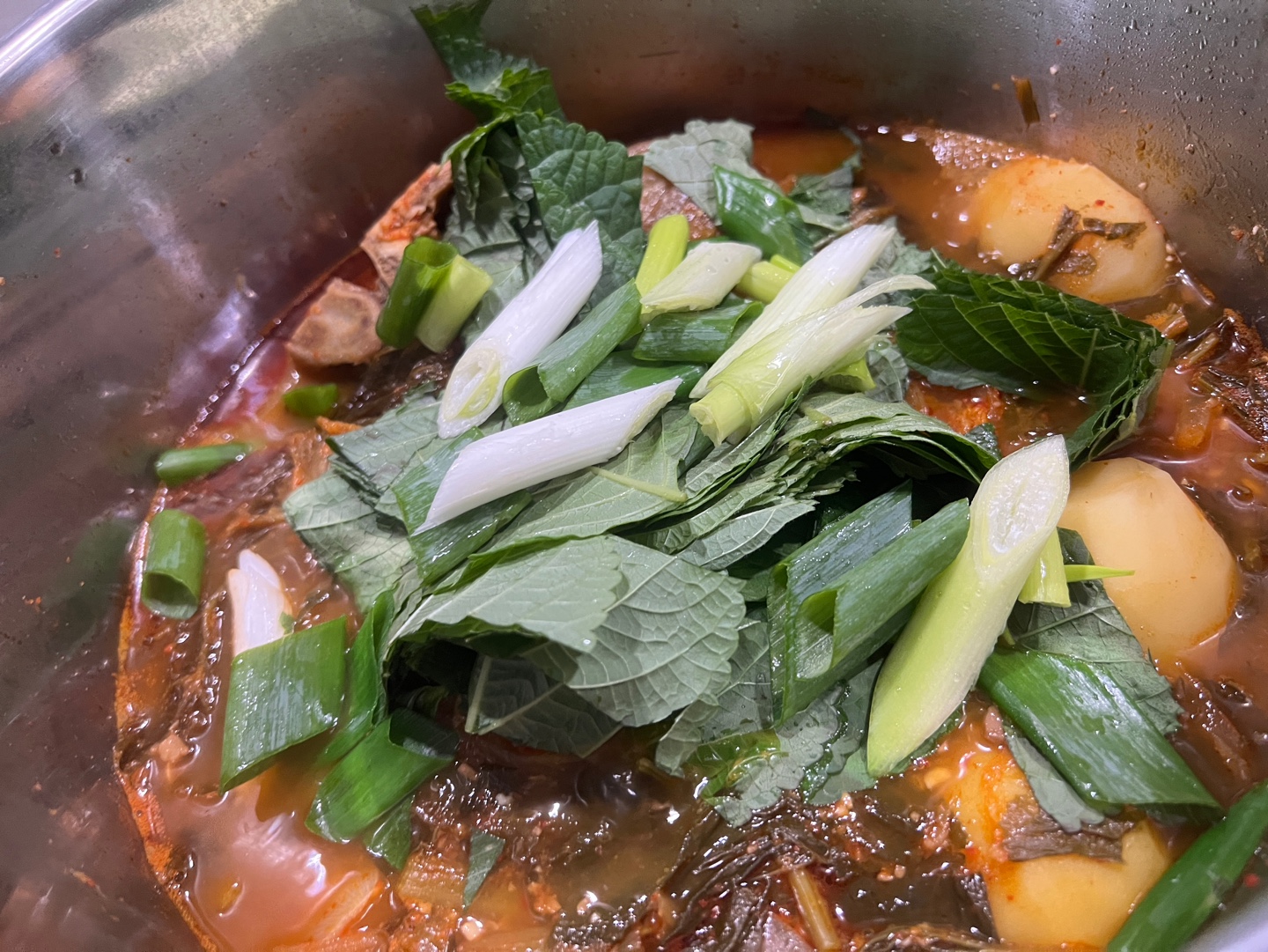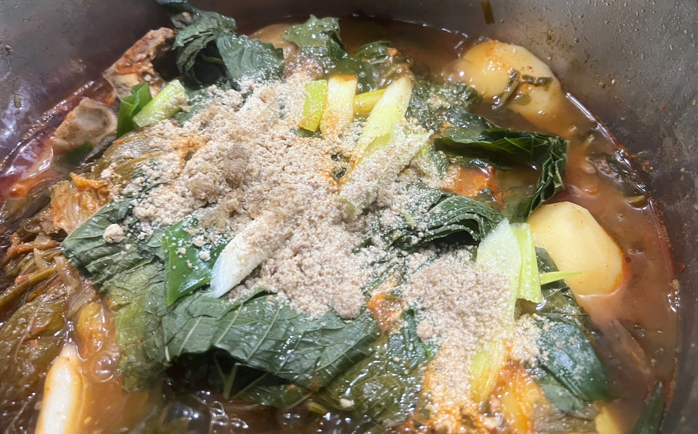 - 대파, 청양고추, 깻잎을 넣고 들깨가루를 풀어 마무리합니다.