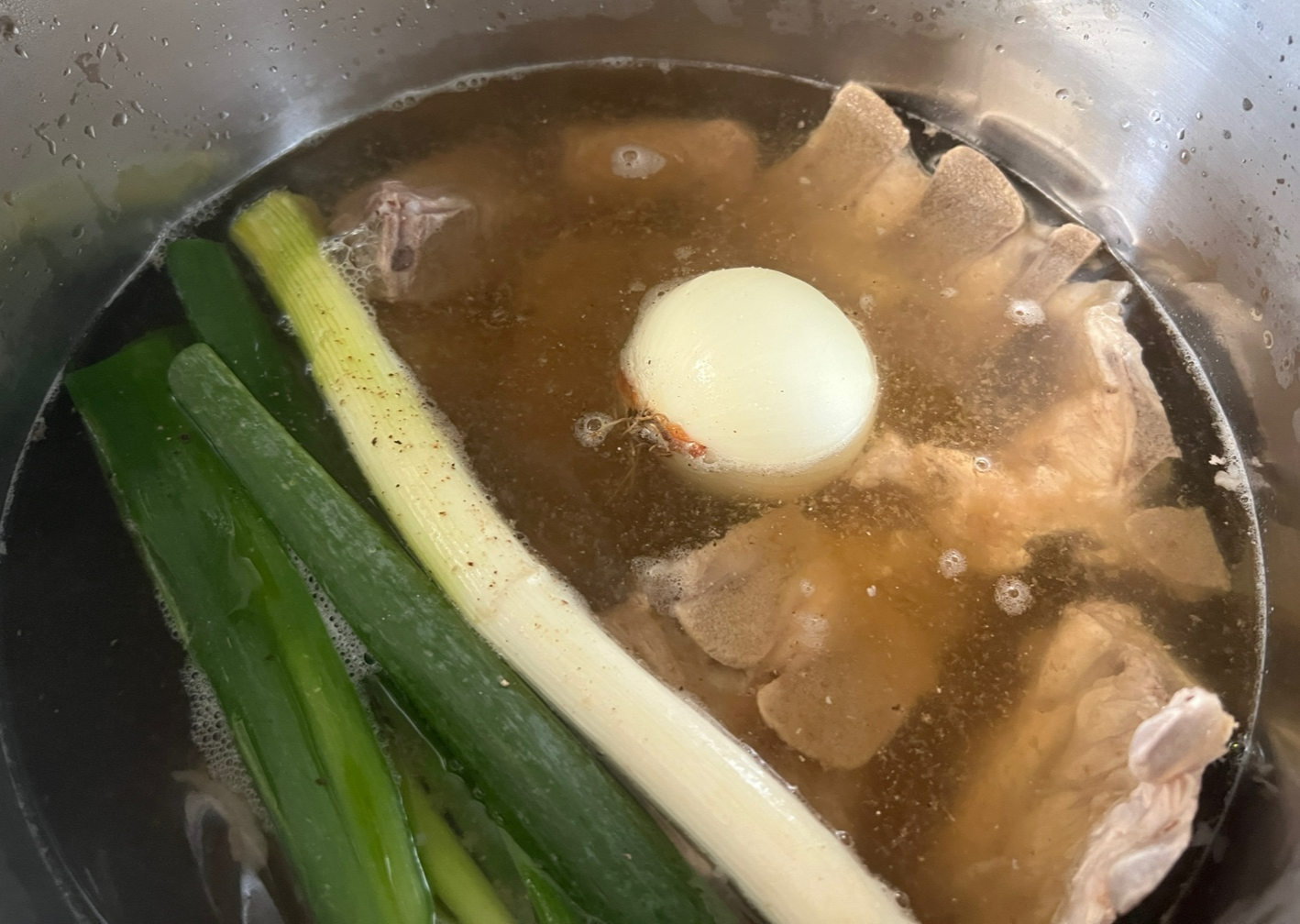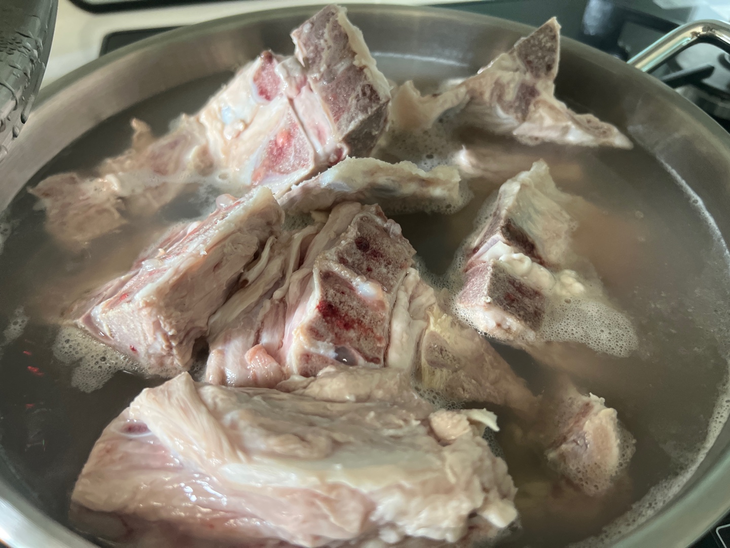 - 큰 냄비에 물을 끓이고, 등뼈를 데쳐내면서 불순물을 제거합니다.