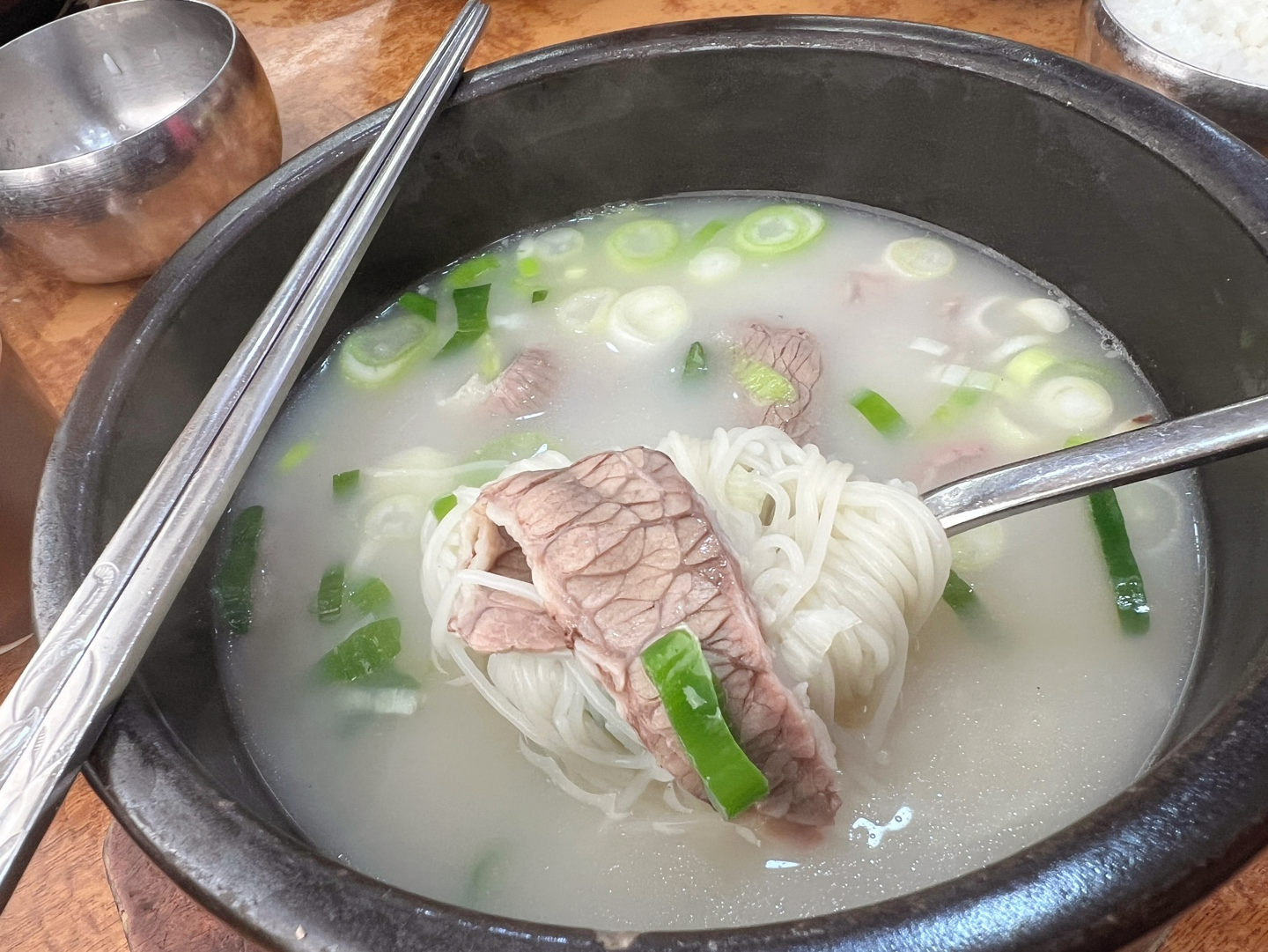 김치는 직접 담근 듯 아삭하고 시원한 맛이었고, 깍두기는 적당히 숙성되어 설렁탕과 잘 어울렸습니다. 우리 설렁탕에는 특이하게 쌀국수로 소면을 넣어주고 볶음 김치까지 있어서 좋았습니다.