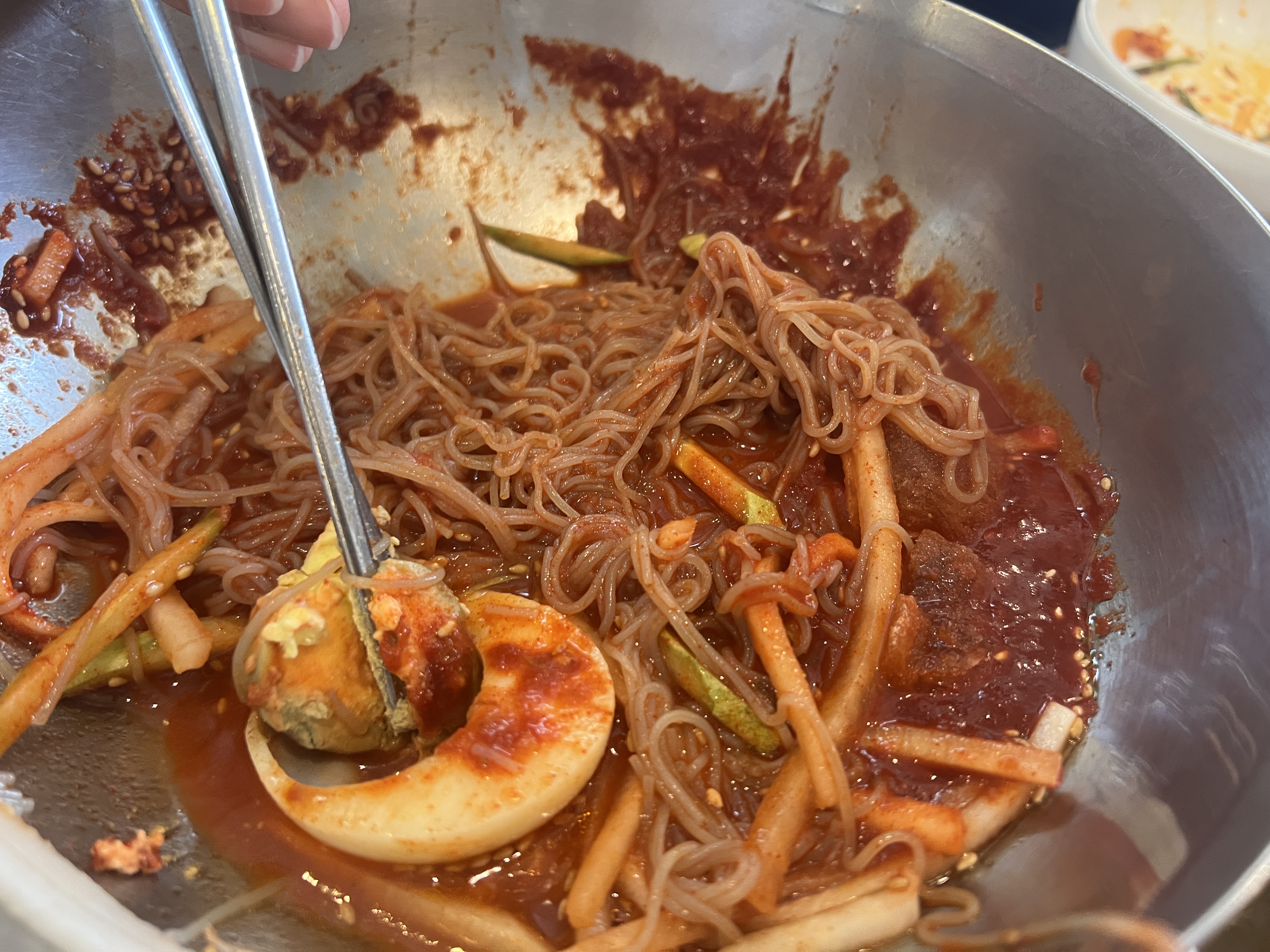 - 비빔냉면: 고춧가루 베이스 양념이 자극적이지 않고, 새콤달콤한 맛이 잘 조화되어 고기와 함께 먹기 딱 좋았습니다.